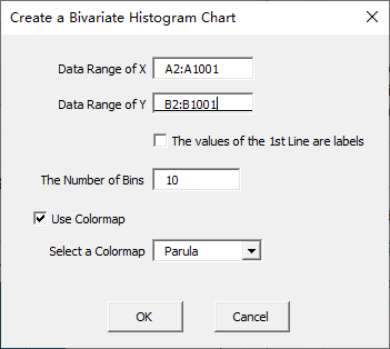 Click “Bivariate” item in “Histogram” menu in xlChart+ add-in, open “Create a Bivariate Histogram Chart” dialog box. Input B2:B1001 in “Data Range of Y” textbox.
