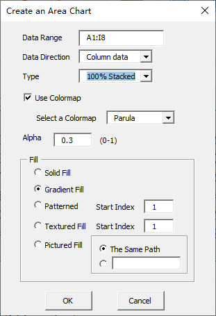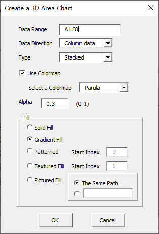 Click “3D” item in “Area Chart” menu in xlChart+ add-in, open “Create an 3D Area Chart” dialog box.