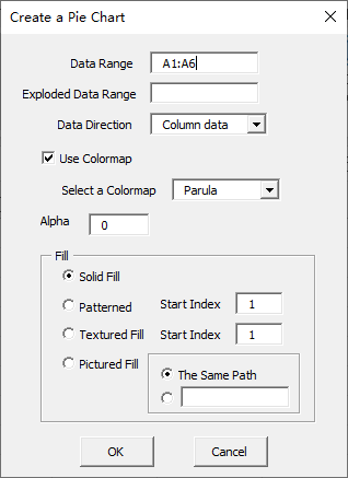 Click “2D” item in “Pie Chart” menu in xlChart+ add-in, open “Create a Pie Chart” dialog box.
