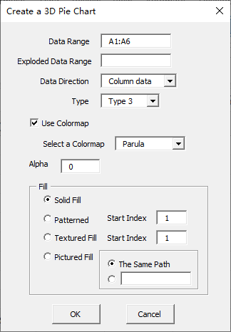 Click “3D-Type1” item in “Pie Chart” menu in xlChart+ add-in, open “Create a 3D Pie Chart” dialog box.