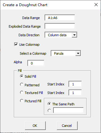 Click “Doughnut” item in “Pie Chart” menu in xlChart+ add-in, open “Create a Doughnut Chart” dialog box.