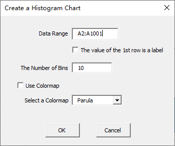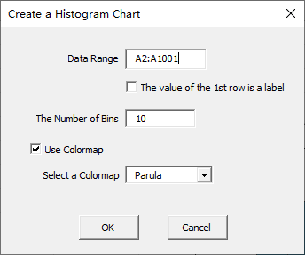 Click “Univariate-Colormap” item in “Histogram” menu in xlChart+ add-in, open “Create a Histogram Chart” dialog box.