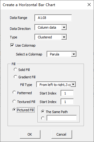 Click “2D Clustered” item in “Horizontal Bar Chart” menu in xlChart+ add-in, open “Create a Horizontal Bar Chart” dialog box, select “Pictured Fill” option button in “Fill” frame.
