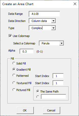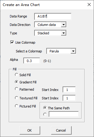 Click “2D” item in “Area Chart” menu in xlChart+ add-in, open “Create an Area Chart” dialog box.