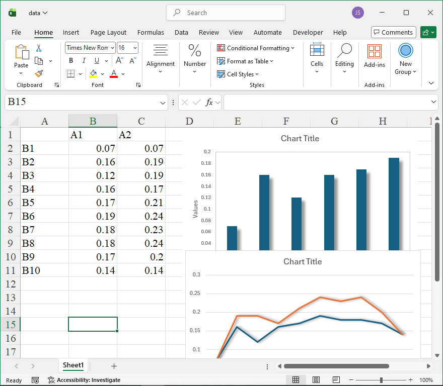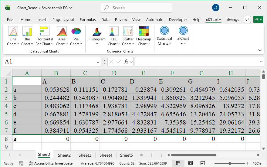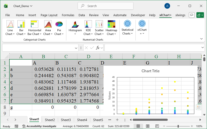 xlChart+ add-in helps you create common charts faster with one-click color schemes. Create histograms, KDE plots, jitter scatter plots, heatmaps, violin plots, raincloud plots, and other charts that Excel doesn’t have.