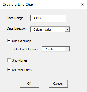 Click “2D Line Chart” item in “Line Chart” menu in xlChart+ add-in, open “Create a Line Chart” dialog box.