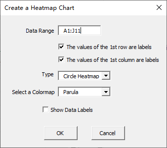 Click “Circle Heatmap Chart” item in “Heatmap Chart” menu in xlChart+ add-in, open “Create a Heatmap Chart” dialog box.
